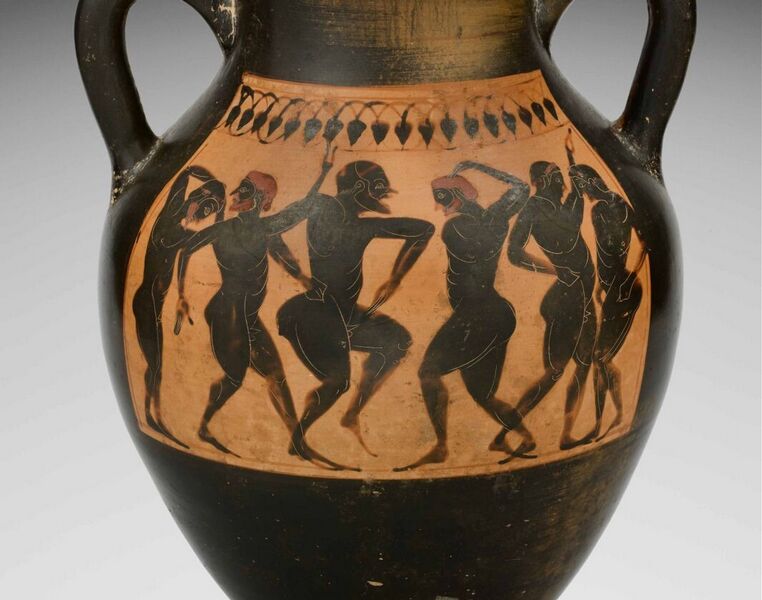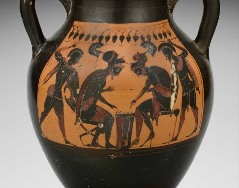 De amfora, vervaardigd omstreeks 525 v.C. in Athene, is het oudste object in de collectie. Je ziet er twee figuren die een bordspel spelen. Het zijn de Griekse helden Achilles (links) en Ajax (rechts). Ze spelen het vijflijnenspel (pente grammai). Daarbij heeft elke speler 5 stenen op 5 lijnen. Het doel van het spel bestaat erin om de 5 stenen als eerste op de middelste of heilige lijn bijeen te brengen. Op dit spel is het Griekse spreekwoord zijn steen van de heilige lijn halen gebaseerd. Dit wil zoveel zeggen als iemand die zich in een uitzichtloze situatie bevindt en iets moet dan wat hij eigenlijk wilde vermijden. De uitkomst van het spel is ook gekend. Net zoals in Troje alleen Achilles eeuwige roem verwierf, zo won hij ook dit spel. Het vijflijnenspel was een kansspel waaruit bleek dat het lot, zoals bepaald door de drie dochters van Zeus (de Moerae of schikgodinnen), besliste wie werd verheven of neergehaald.