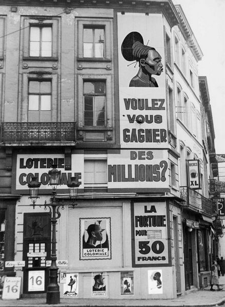 Straatreclame van de Koloniale Loterij op het Sint-Joostplein te Brussel