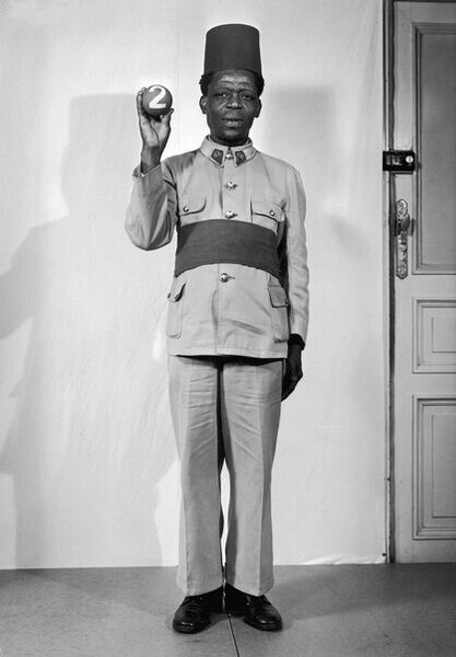 Een personeelslid van de Koloniale Loterij aangesteld om bij de trekkingstrommels de winnende nummers te tonen.
