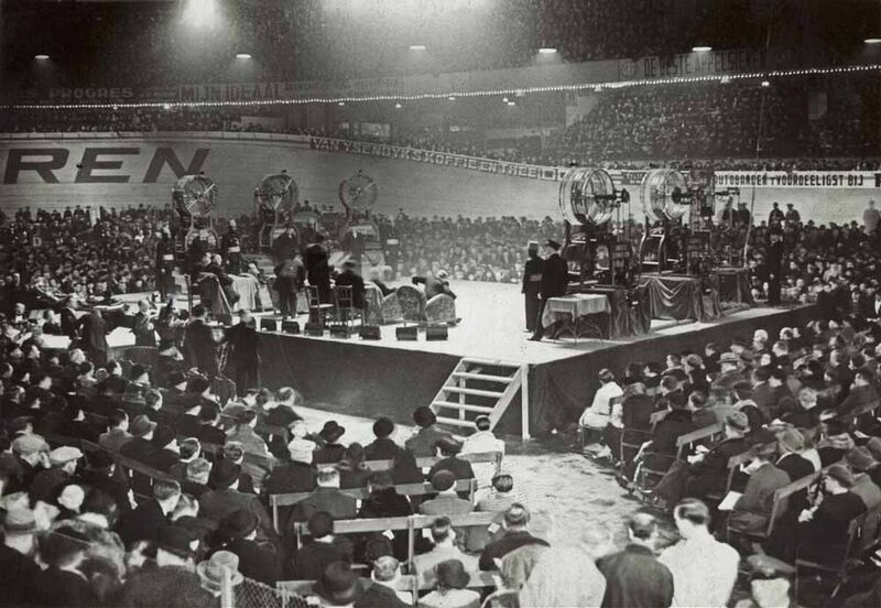 Grote sportmanifestaties waren uitgelezen plaatsen om trekkingen van de Koloniale Loterij te organiseren. Hier zien we een trekking in een tot de nok gevuld Sportpaleis in Antwerpen.